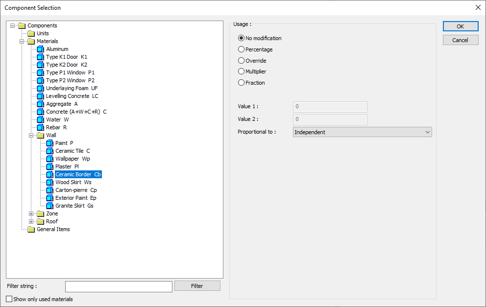 Click the OK button. The "Component Selection" dialog will be closed. A summary line of the material will appear in the Building Components tab. More than one material assignment can be made to an object.