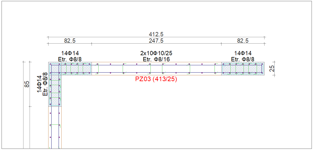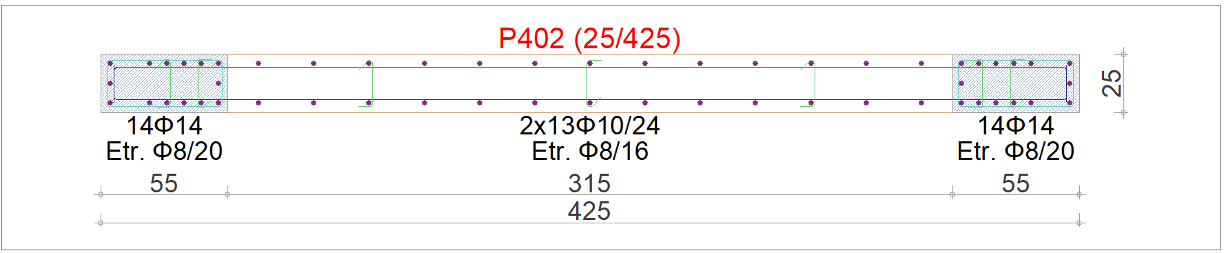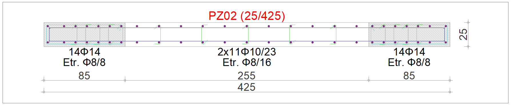An example shape of the wall end zones formed within the wall thickness along the Critical Wall Height for a single wall is shown in the picture below. As can be seen, the length of the curtain in plan is 425 cm and its thickness is 25 cm. In this case, according to 7.6.2.3 , 20% of the total length in the plan (425 * 0.2 = 85 cm) and twice the thickness of the curtain (25 * 2 = 50 cm) are arranged so that they are not less than the values.