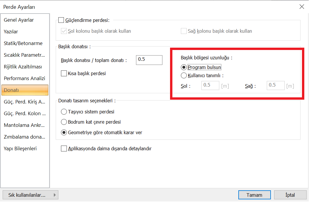 Curtain end zones are automatically determined by the program or can be entered as user defined. In the "Reinforcement" tab of the Curtain Settings window, the header zone length options are outlined in red in the picture below.