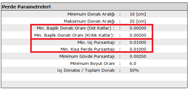 The Curtain Parameters table of the Curtain Group Preliminary Information report is shown in the following picture . In this report, minimum longitudinal reinforcement ratio values for wall end zone specified in 7.6.5.1 are shown.