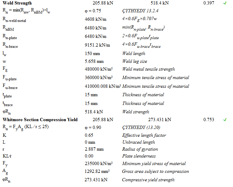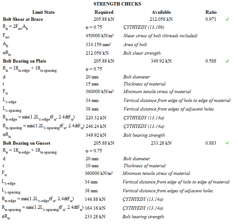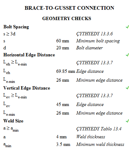 Brace center connection design is made automatically according to the Design, Calculation and Construction Principles of Steel Structures (ÇYTHYEDY) , AISC 360-16, and the connection report is created.