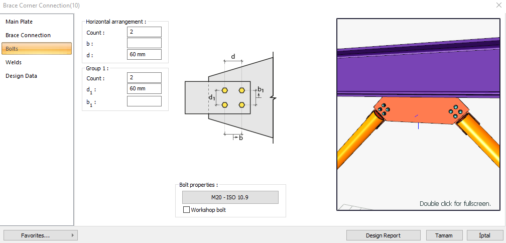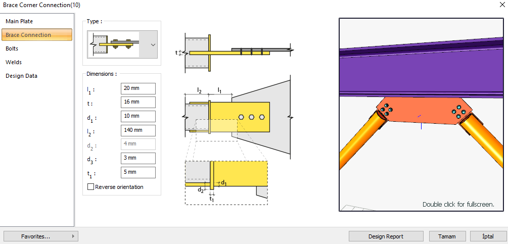 The brace corner connection is formed by bolting and welding the steel brace member to the column, beam or column-to-beam connection. Bolt control, weld control, plate control and connection application limits control are performed automatically according to the placement of the elements of the connection. Brace corner connection design is made automatically according to the Design, Calculation and Construction Principles of Steel Structures (ÇYTHYEDY) or AISC 360-16 regulations and a connection report is created.