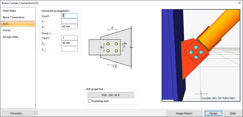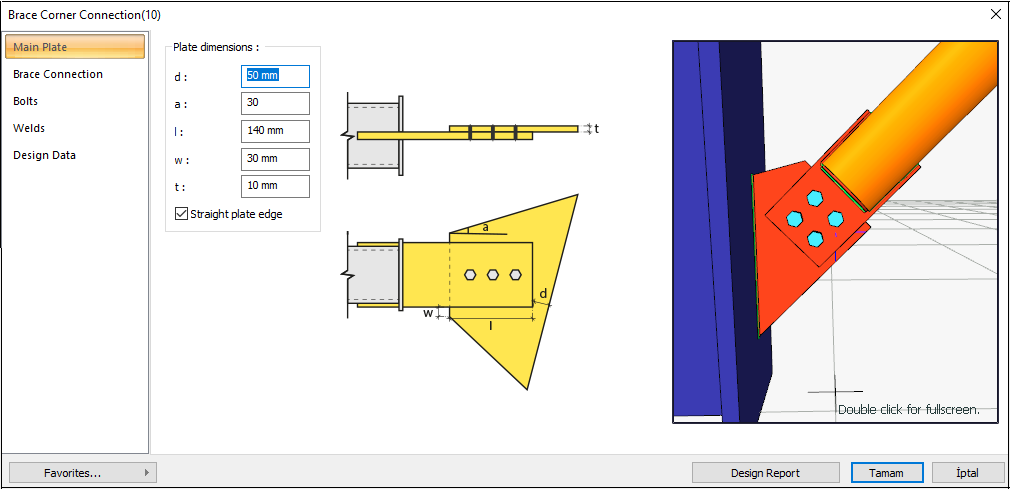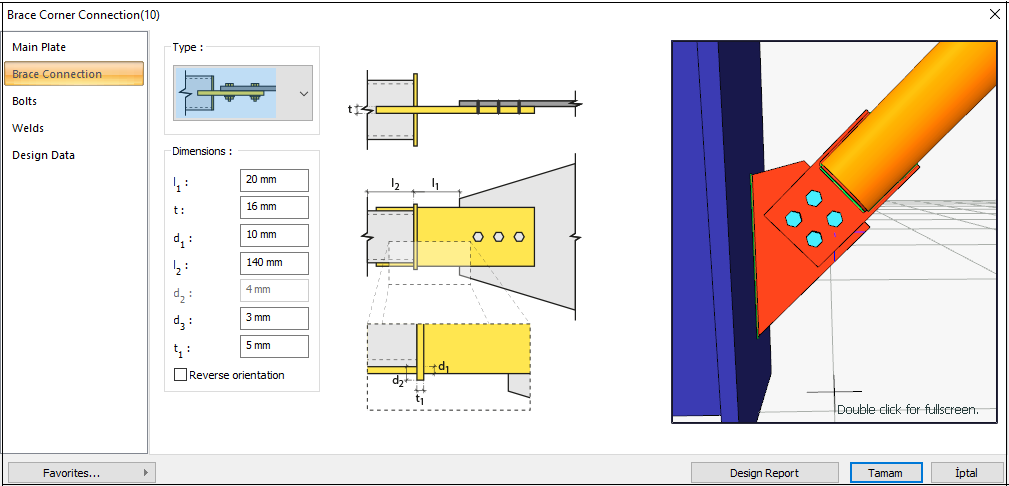 Brace-corner connection design limit states and geometry checks are done automatically according to AISC 360-16.