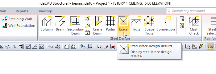 After the analysis is done, you can access it by clicking the Brace command under the Steel Design heading in the ribbon menu Analysis and Design tab .