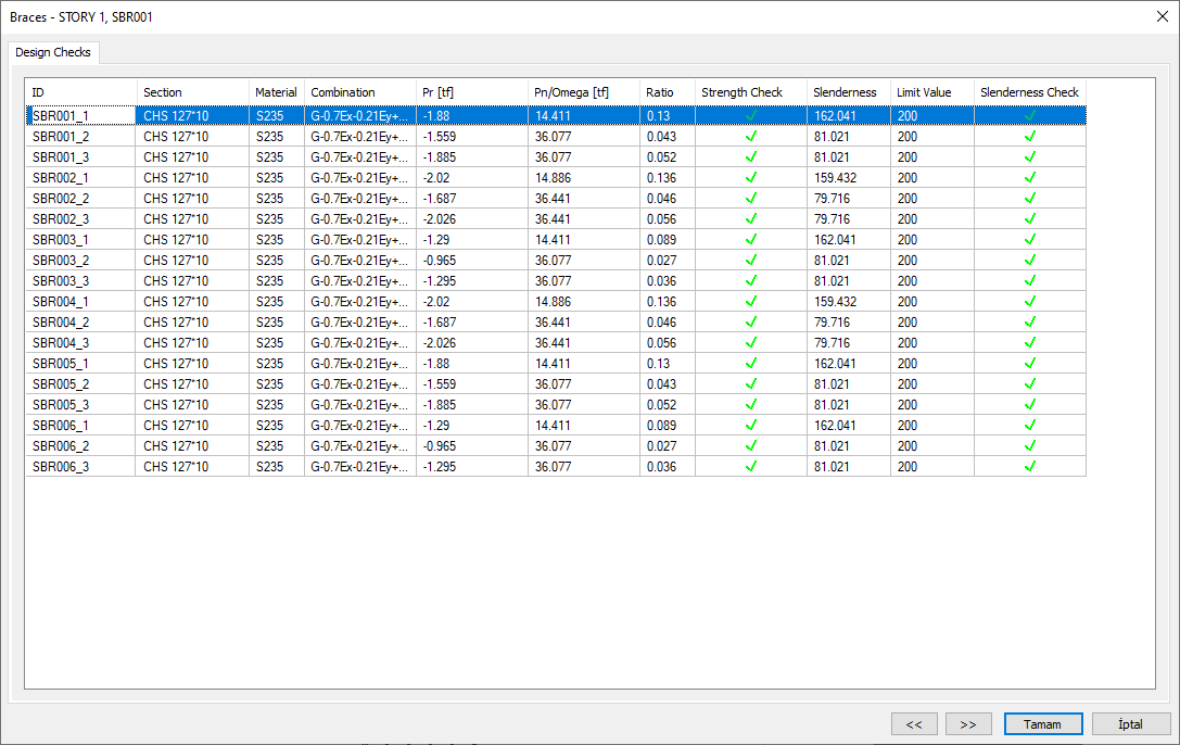 Steel brace design results and inadequacies of steel braces are displayed in the Braces dialog. The diagonals dialog displays the axial compressive strength ratio, slenderness control, and design ratio.