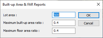 In the Built-up Area & FAR Reports dialog that opens, enter your lot area, maximum built-up and floor area ratio.