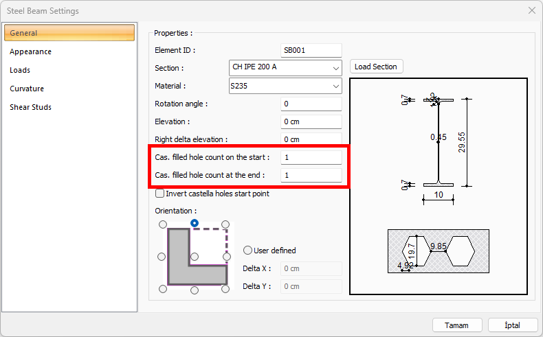 "Cas. filled hole count on the start" and "Cas. filled hole count on the end" of the element whose name and floor are given can be increased. This technique is one of the first choice solutions for vierendeel control. It can be done from the "General" tab of the “Steel Beam Settings” dialog.