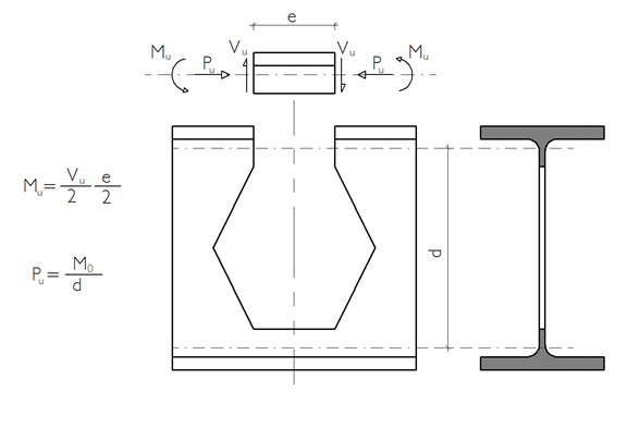 Vierendeel bending control: The effects on the T-section on the Castellated beam gap are found by using the free body diagram. This control is made by calculating the interaction of flexure and compression of the T-section.