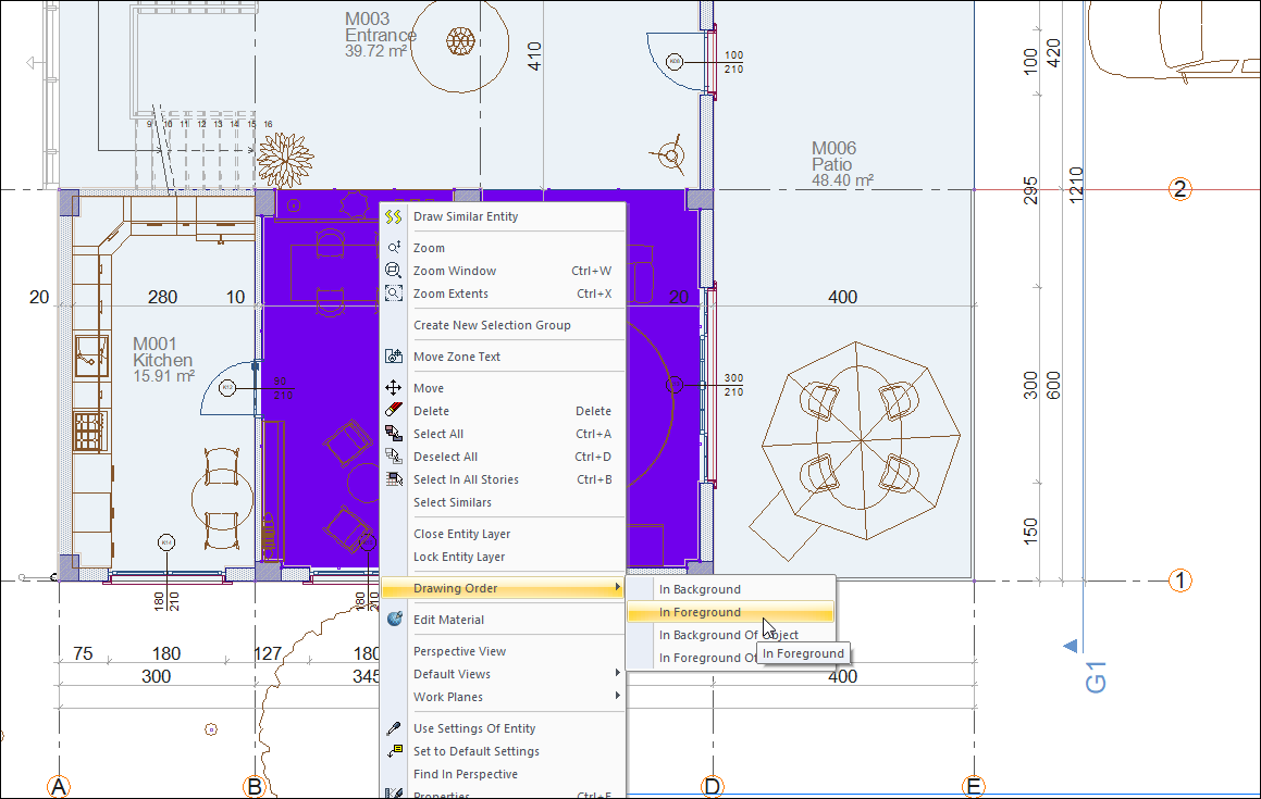 If there are other objects on any object in the drawing, the lower or upper object is selected and the selected object is brought to the background or foreground with the "Drawing Order" command from the right click menu.