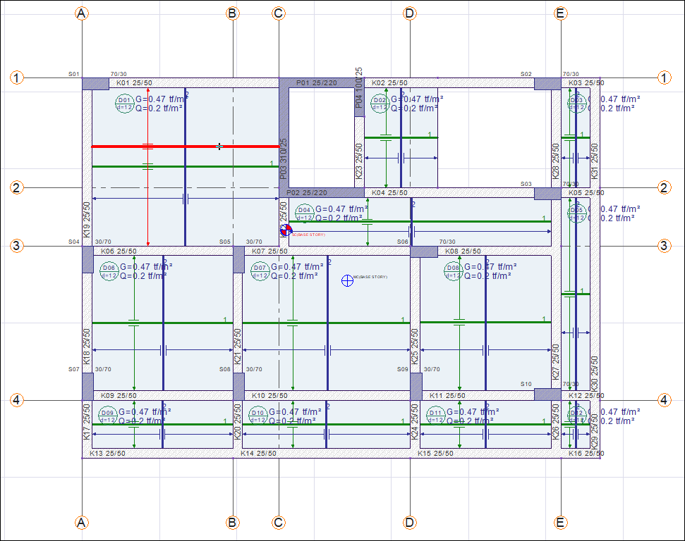 When the slab is defined, it defines two slab calculation axes in the horizontal and vertical directions based on the middle of the slab. With the "Concrete/Slab/Change concrete calculation line geometry" command, the position and/or working distance of a drawn calculation axis is changed.