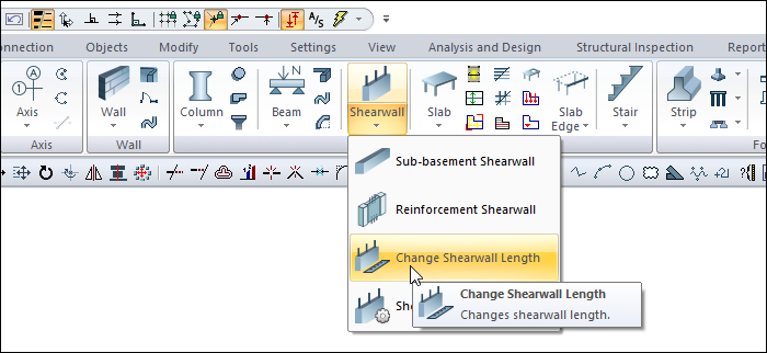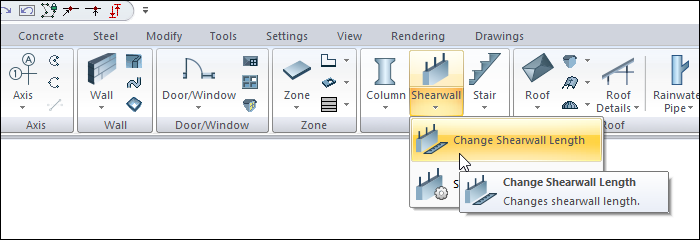 The Change Shearwall Length command is used to change the length of a selected shearwall or lengthen or shorten it by a specified amount.