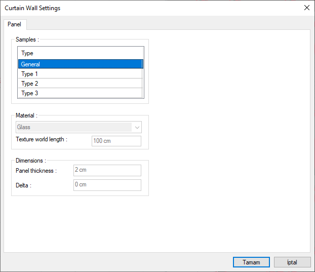 Select one of the general, type 1, type 2 and type 3 options from the curtain wall settings dialog that opens.