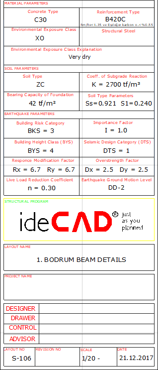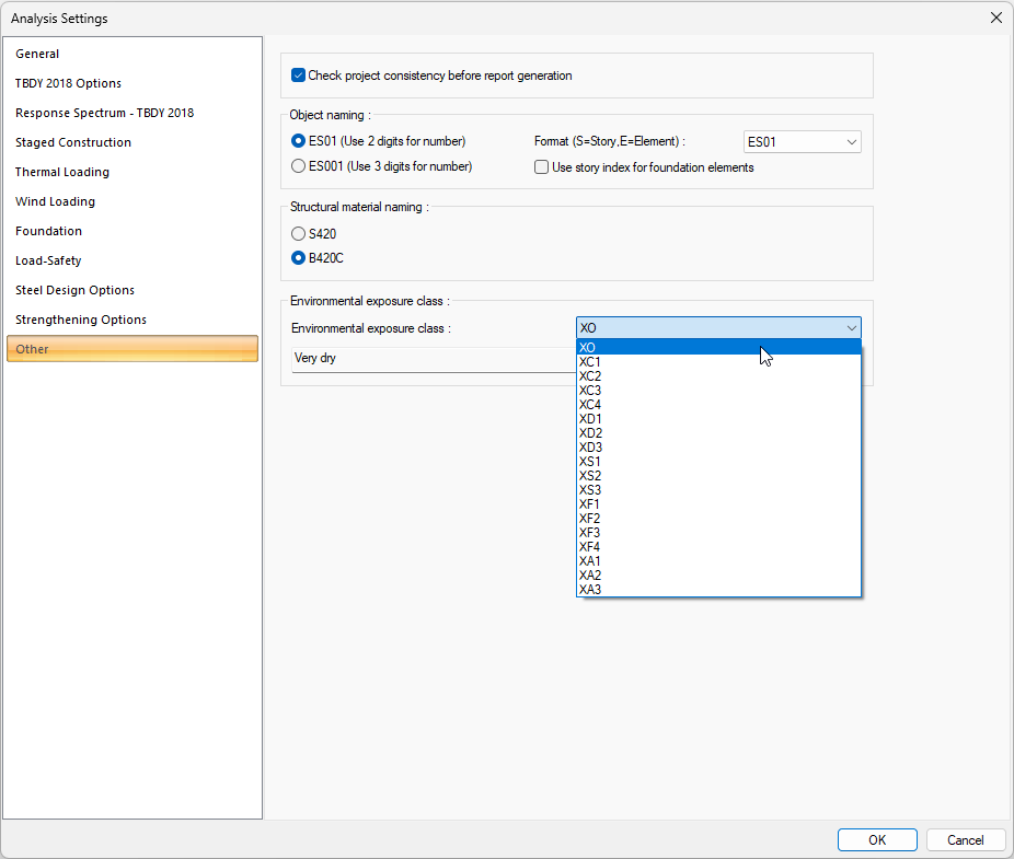 Referring to the clause stated in TBDY 2018 7.13.1.1, the environmental exposure class will be specified on the drawing sheets, you can select the "Environmental exposure class" from the drop-down list on the Analysis Settings/Other tab to be shown on the drawing letterheads .