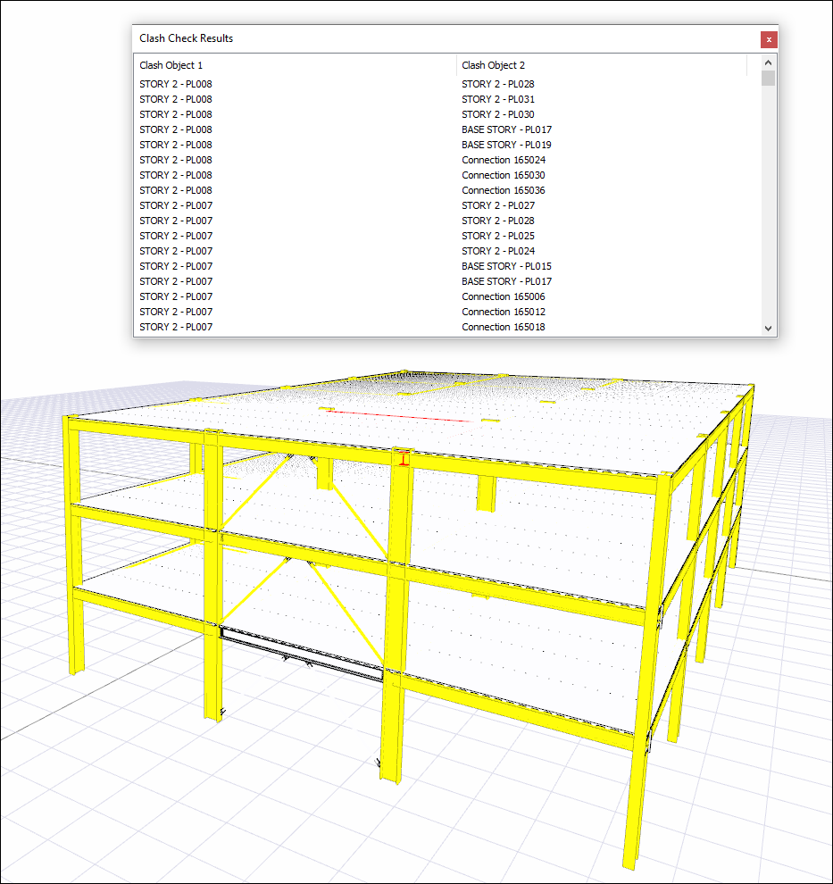 With the clash check command, it is automatically checked whether there is a clash in the structure created by the steel sections and steel connections selected by the user. If there are clash elements, their names and the story they are located in are written in the list. In addition, clash elements in the viewport are grouped by painting them in yellow or red.