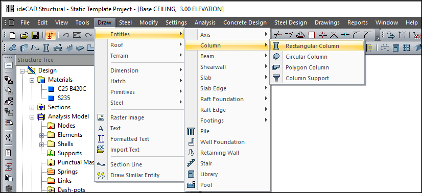 For example, the Draw menu in the upper screenshot is Entities/ Column sub-menu and Rectangular Column is the command.