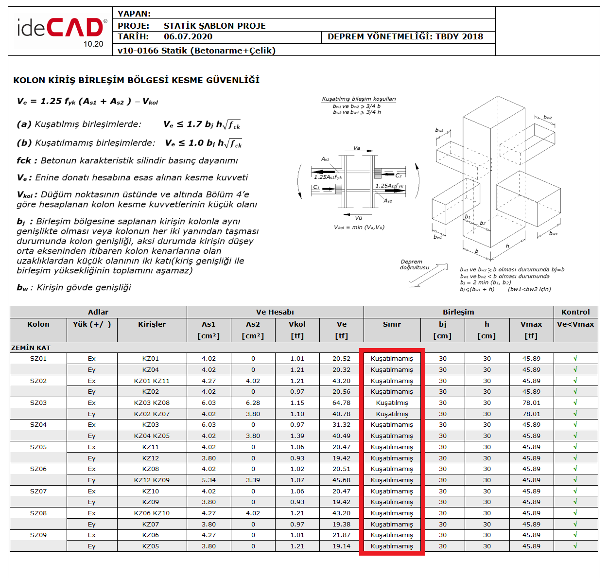 This classification is shown in the Column-Beam Junction Area Shear Safety report. The following picture shows an example of a report and the classification status made according to 7.5.1 .