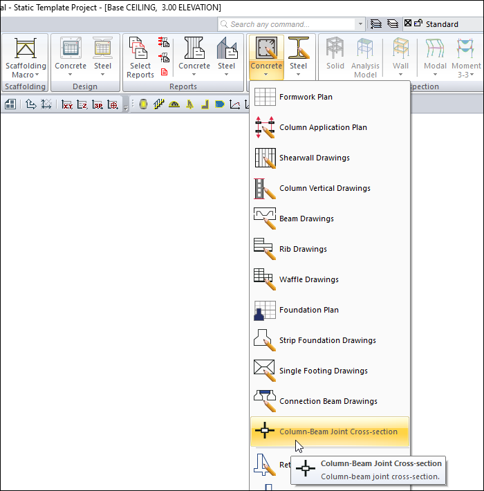 With the Column-Beam Joint Cross-Section command, the column-beam connection horizontal section of the project is created.