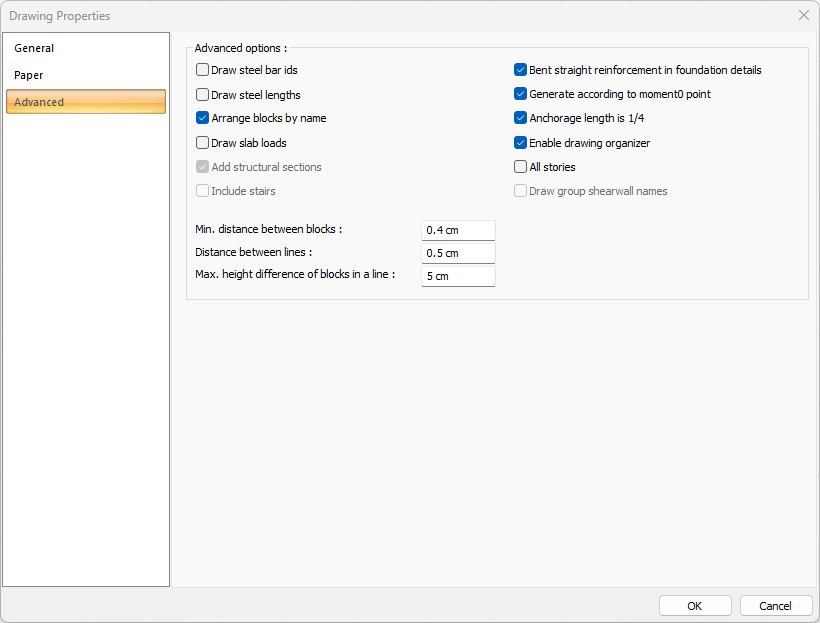 Distance between lines ![]() Minimum vertical distance between blocks is entered. The block is each opening itself, with its rebars, sections and dimensioning. |