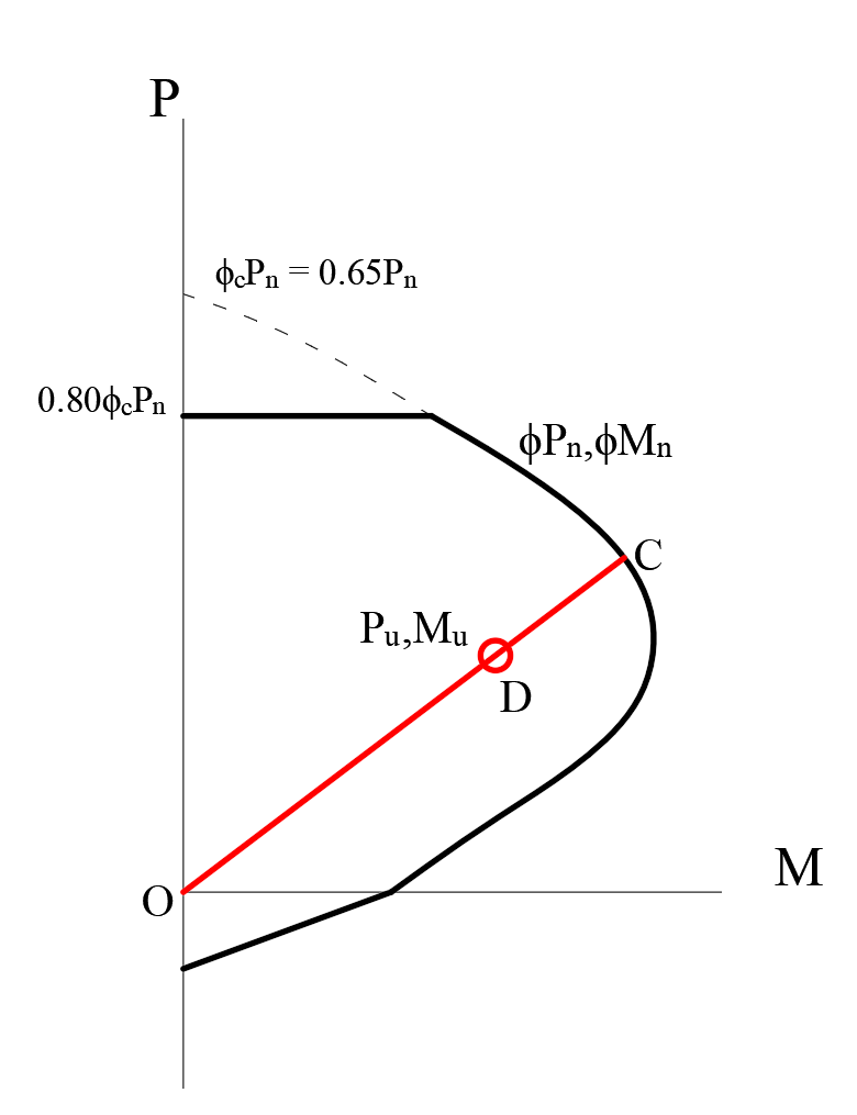 Because of the axial force and biaxial bending interaction in the columns, the demand/capacity ratio is calculated using the interaction curve. The point (Pu,Mu) is placed in the interaction space shown as point D in the picture below. If point D (Pu,Mu) is within the acceptable range, the column capacity is adequate. However, if the point D (Pu,Mu) is outside the interaction volume, the column is overstressed. The capacity ratio is calculated using point C obtained by extending the line passing through points O and D to the interaction curve. The capacity ratio is given by the ratio OD/OC.