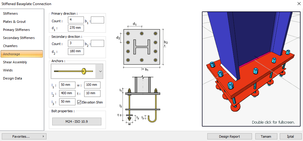 Column-Foundation Connection or Stiffened Base Plate Connection is formed by connecting the base plate welded to the steel column and anchored to the concrete foundation (column). Stiffened base plate design is made automatically according to the Design, Calculation and Construction Principles of Steel Structures (ÇYTHYEDY) (GKT and YDKT) and AISC 360-16 (ASD and LRFD) regulations. In the stiffened base plate connection calculation, bolt, weld and plate controls, geometry controls and strength controls are made automatically in accordance with the steel connection type.