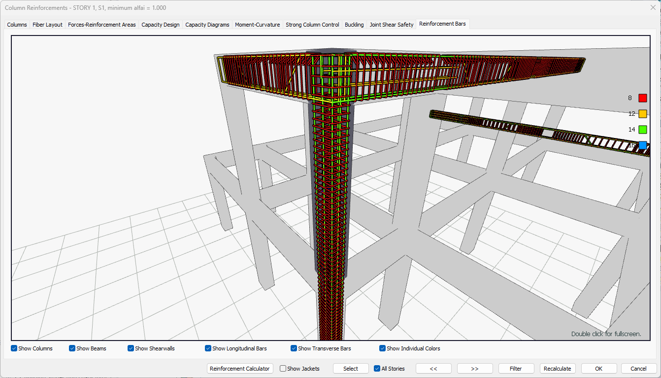 Column reinforcement design results and inadequacy conditions for columns are displayed in the Column Reinforcements dialog. In the column reinforcement dialog, the results of column transverse and longitudinal reinforcements, internal forces calculated as a result of the analysis, increased internal forces related to TBDY, capacity ratios, shear safety of column-beam connection, strong column control are given. Column reinforcements are changed and fixed in the Column Reinforcements dialog.