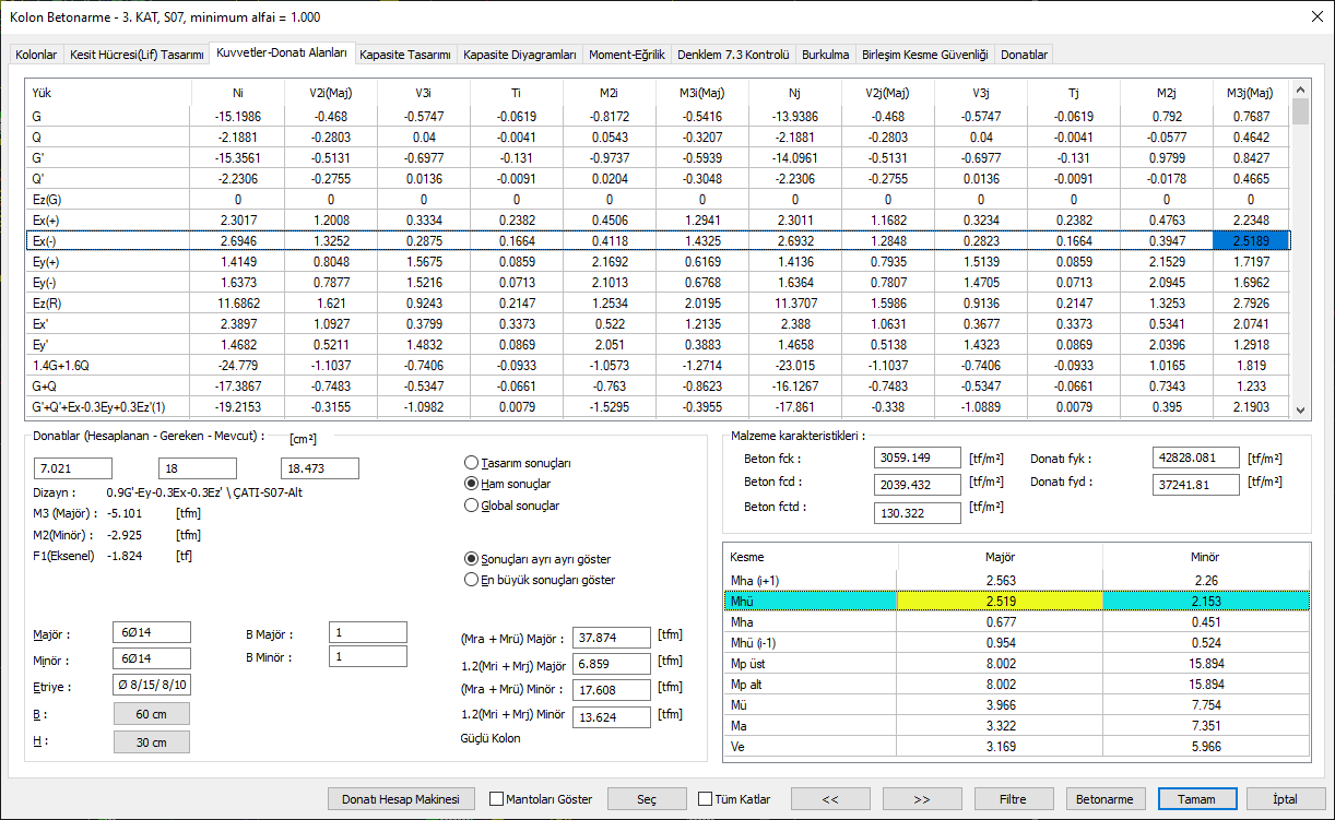 Major and minor bending moments and beam bearing strength moments can be seen at the upper and lower joints in the column reinforced concrete dialogue.
