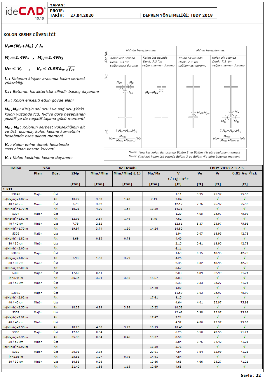 Shear safety report of the columns is given as a subtitle in the column report. In column shear safety control, V e design shear strength is controlled according to the upper condition limits given in TS500 and TBDY and also by taking the upper limit of V r shear calculated from the transverse reinforcement .