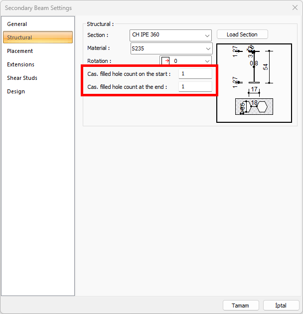 For Vierendeel control, "Cas. filled hole count on the start" and "Cas. filled hole count on the end" of the element whose name and floor are given can be increased.