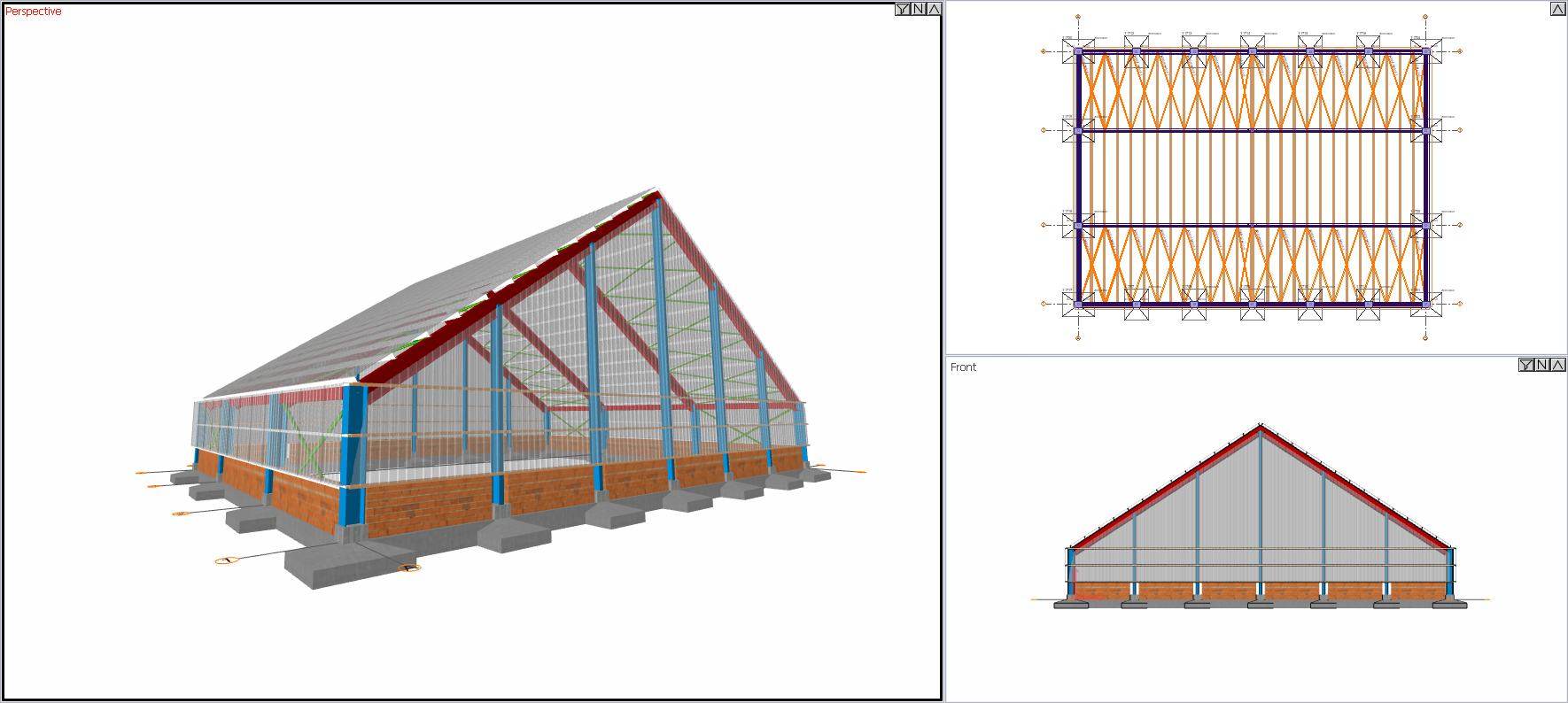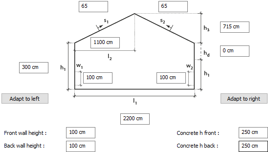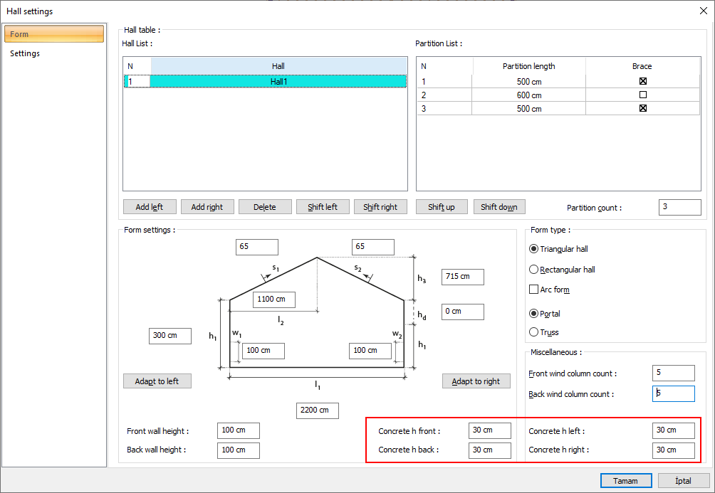 Concrete column heights of the selected hall in the hall settings dialog are changed. There are concrete column settings for the front and back facade from the form settings part in the hall settings dialog, and for the left and back facade from the other part.