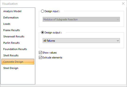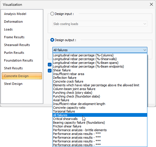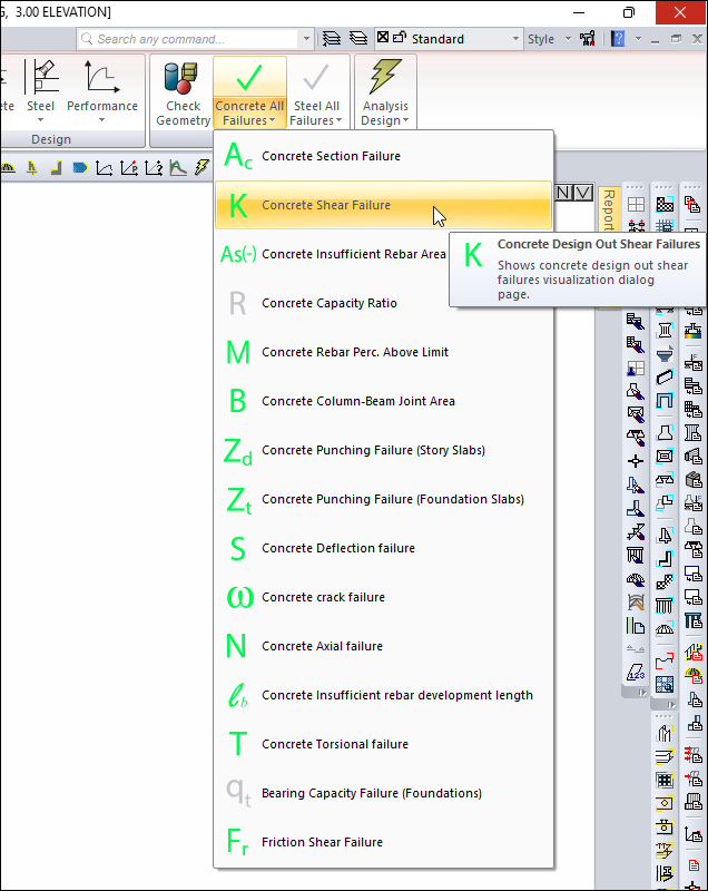 You can access the Concrete Design Output tab by clicking one of the commands under the Output title Concrete All Failures command in ribbon menu Structural Inspection tab .