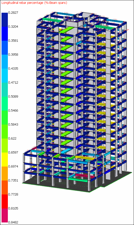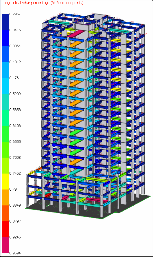 Longitudinal rebar percentage (% -Beam endpoints) ![]() The beams with different support dimensions are painted in different colors on the view window. From the scale on the left of the screen, it can be seen which color corresponds to which pursmail value in percentage. ![]() |