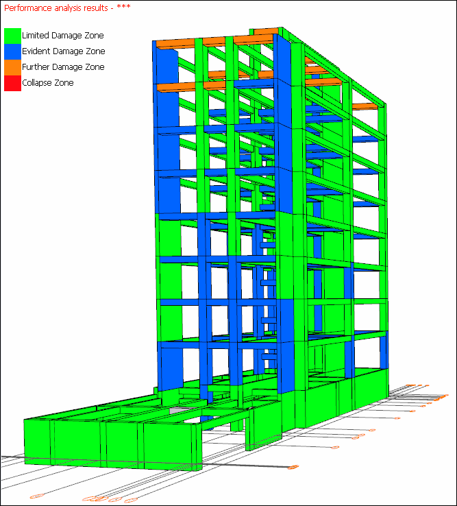 Performance analysis Damage zone occurring in the elements for a selected loading condition are displayed on the structure in the view window. Which color indicates which damage zone can be seen from the color scale on the left of the screen. ![]() |