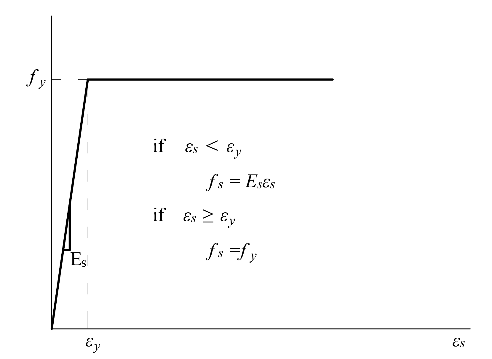 For non-prestressed reinforcement bars, the stress value below fy is equal to Es times εs which is the value from the strain diagram at the location of the reinforcement. For strains greater than that corresponding to fy, stress is constant and equals fy.