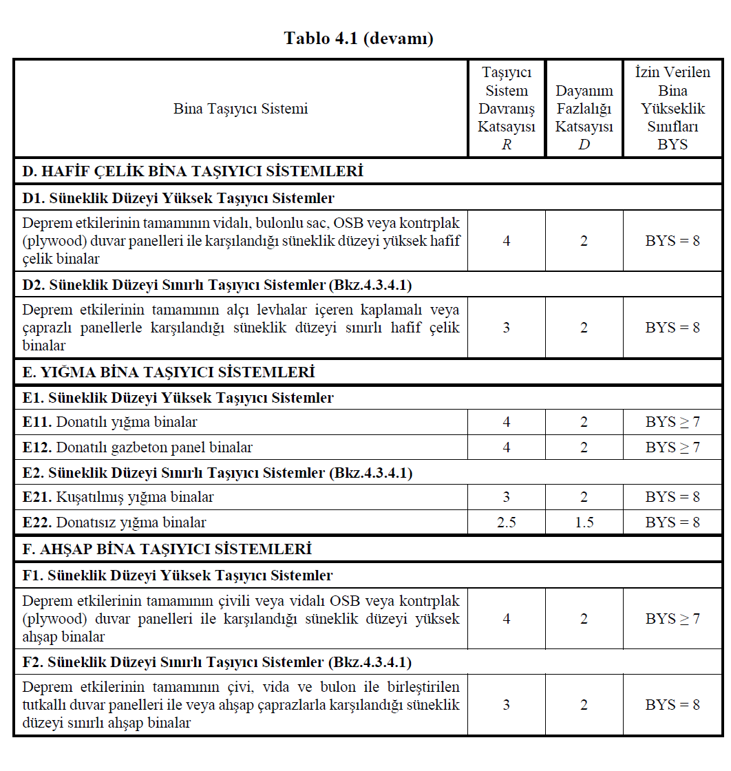 If the upper boundary condition in this relation is not fulfilled, the R and D coefficients defined in Table 4.1 for cases where all earthquake effects are met with walls with high ductility level or braced frames and the maximum permissible DMS will be taken into consideration. If the lower limit condition is not fulfilled , the R and D coefficients given in Table 4.1 will not be changed, but one more of the upper permitted IMS will be considered.