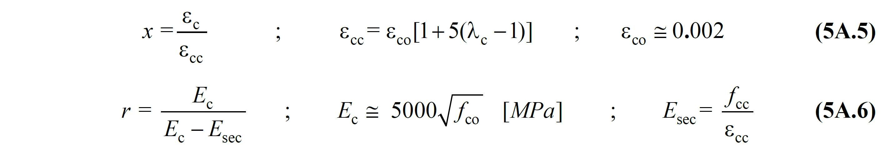 Here ε c represents the concrete unit pressure deformation and means the horizontal axis of the graph shown in Figure 5A.1 . In this case , the graph shown in Figure 5A.1 is obtained by using variables f c and ε c . ε cc confined concrete pressure unit of strain, ε co raw edge is concrete compressive deformation unit. ε cc and ε code in Eq. (5A.5) 'there is a relationship as shown. If the winding effect is not taken into account, λ c = 1 as described above . In this case ε cc = ε coand has a unit strain relation for unconfined concrete. If the winding effect is taken into account, λ c > 1 and in this case the x relation is written for confined concrete.