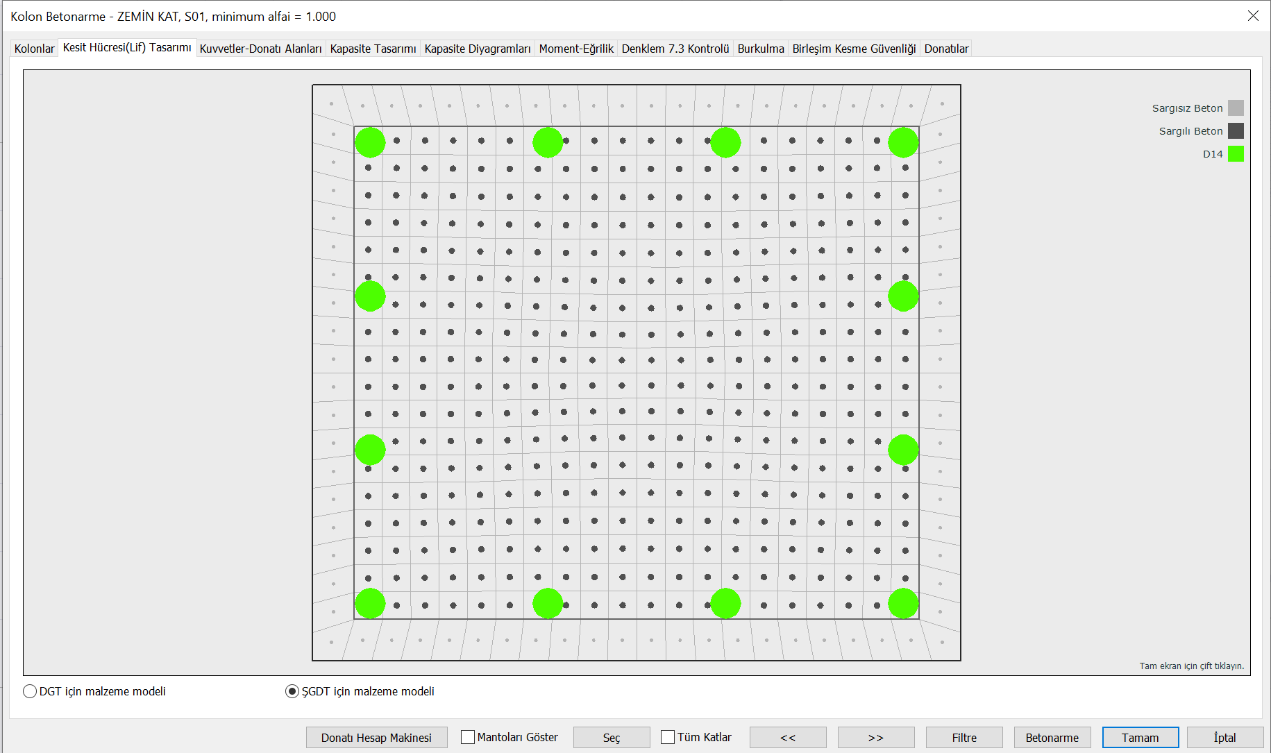 The moment-curvature relation derived to find the cross-sectional properties of plastic hinges in the Assessment and Design Based on Deformation (SSC) approach is derived according to the concrete material model described above. The following figure shows a section cell-fiber (fiber) model of an example reinforced concrete element. Here, each fiber (fiber) is defined according to the concrete material model described above. The fibers shown in dark gray are modeled as confined concrete and the fibers shown in light gray as uncoiled concrete . The ones shown in green are the fibers defined by the reinforcement material model.