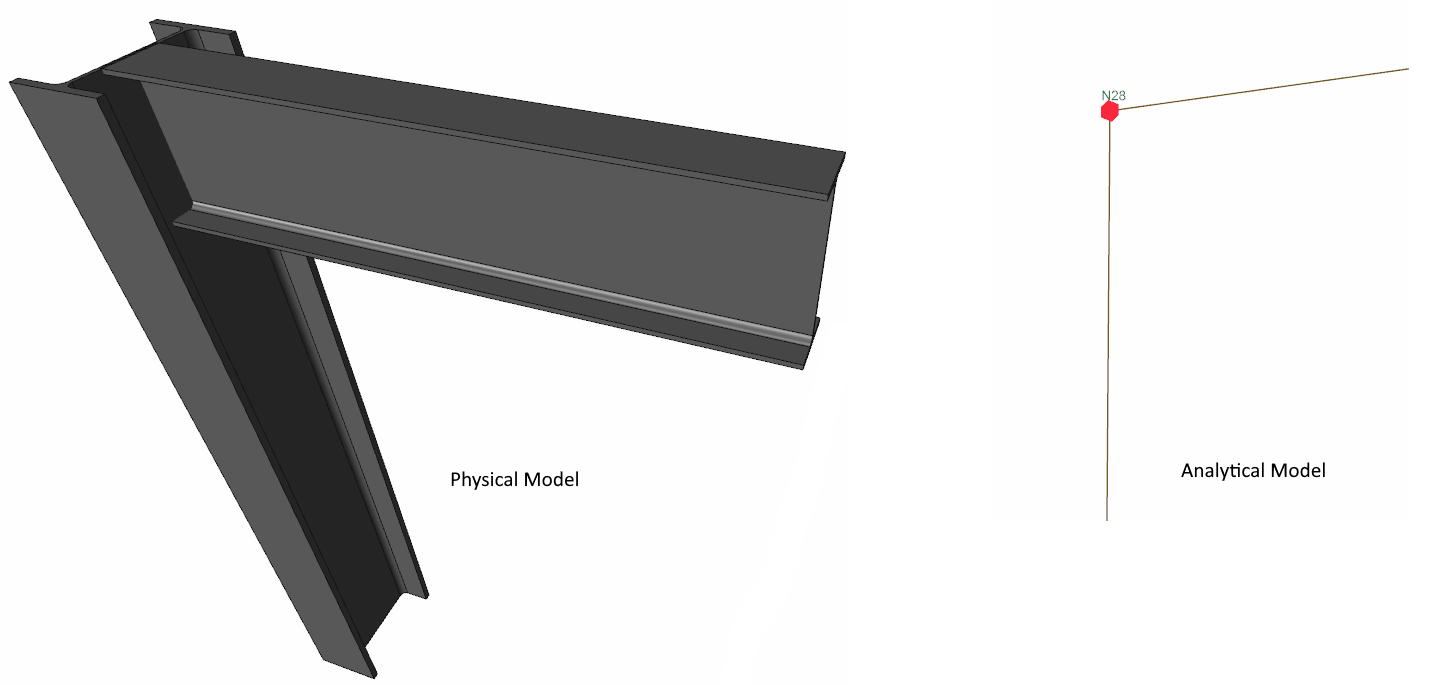 Single connection: If steel column and steel beam elements are modeled with middle offset, no link is formed in between. The only connection created, the node point, is represented in the analytical model with 6 degrees of freedom.