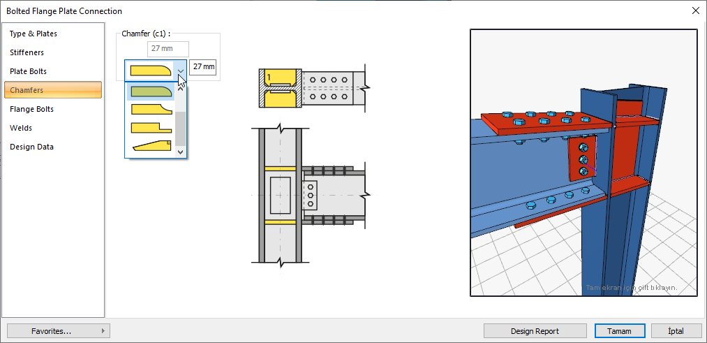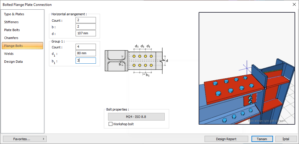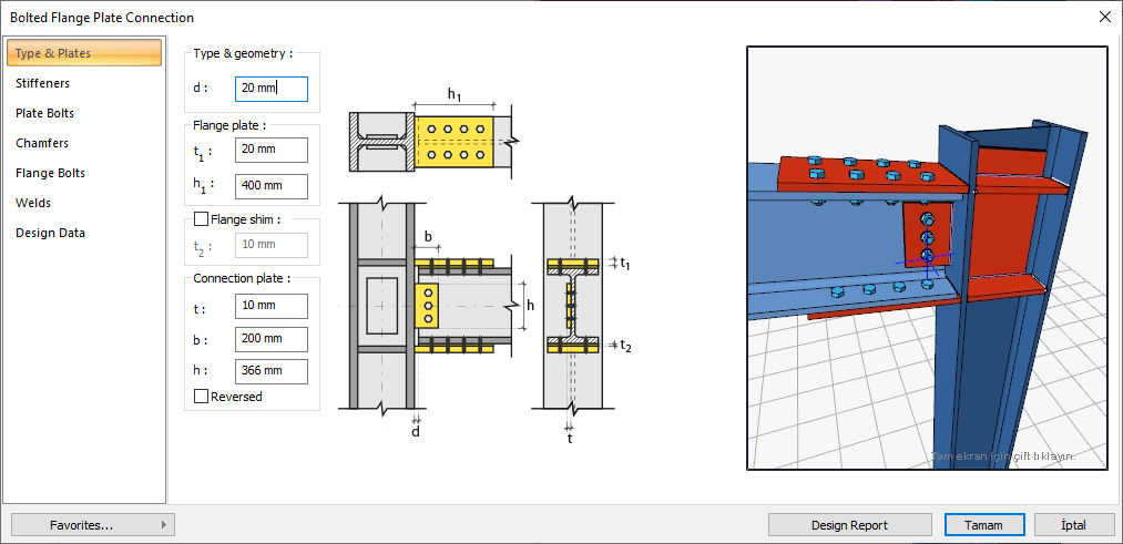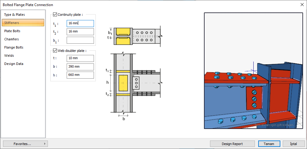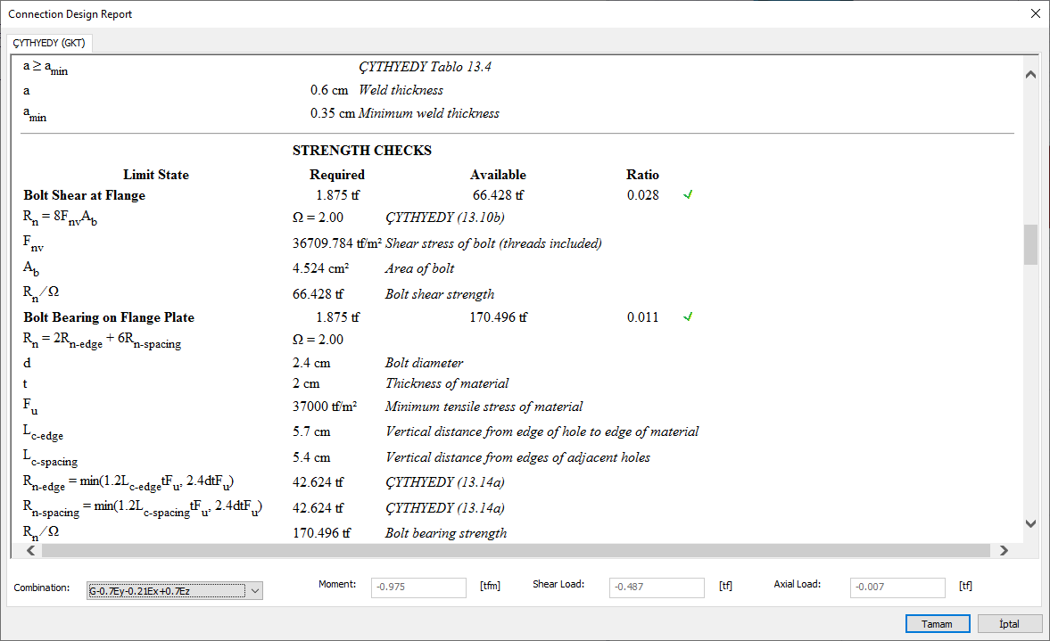 Design reports of the calculated connections can be displayed with the Design Report button in the connection dialog.
