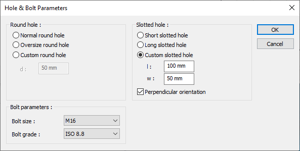 Bolt diameter, bolt class and bolt hole type are determined in the bolt properties dialog.