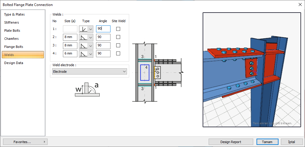 Full penetration butt welding is designed to use all the strength of the main element as a result of the welding of the welded element completely. According to the American Welding Society (AWS), the metal material used as the electrode must have the same properties as the main element metal material. The program compares the beam, column and connection material to determine the welding electrode. If the materials are not compatible, the program warns the user that the source control is wrong. The properties of the main element and the electrode must be the same. An abbreviated list of compatible materials is available in AISC Specification J2.6.