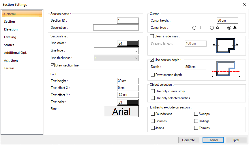With the "Use section depth" option in the Section/View settings dialog, a depth parallel to the section/view line is determined and only the section/view of that area is taken.