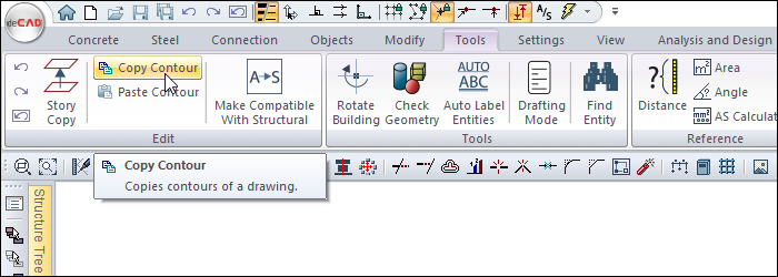 The copy contour command memorizes the contour line delimiting the axes. The memorized contour line can be copied on the intended story with paste contour.