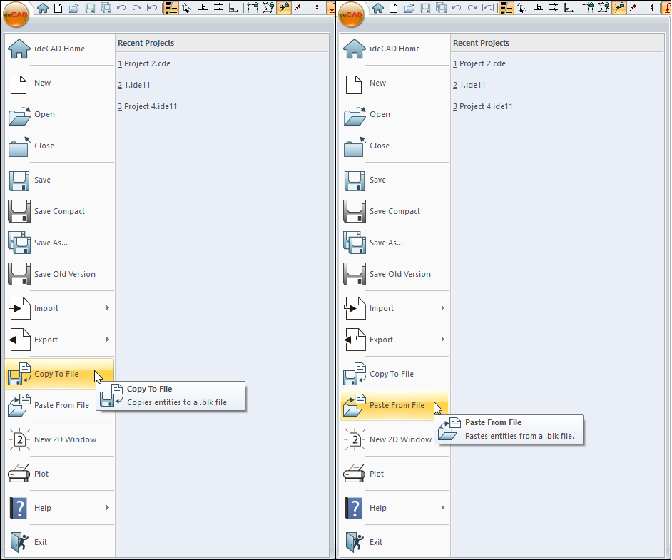 Copy to File, Paste from File commands can be accessed from the menu below the ideCAD icon in the upper left corner of the program.