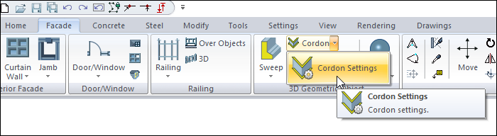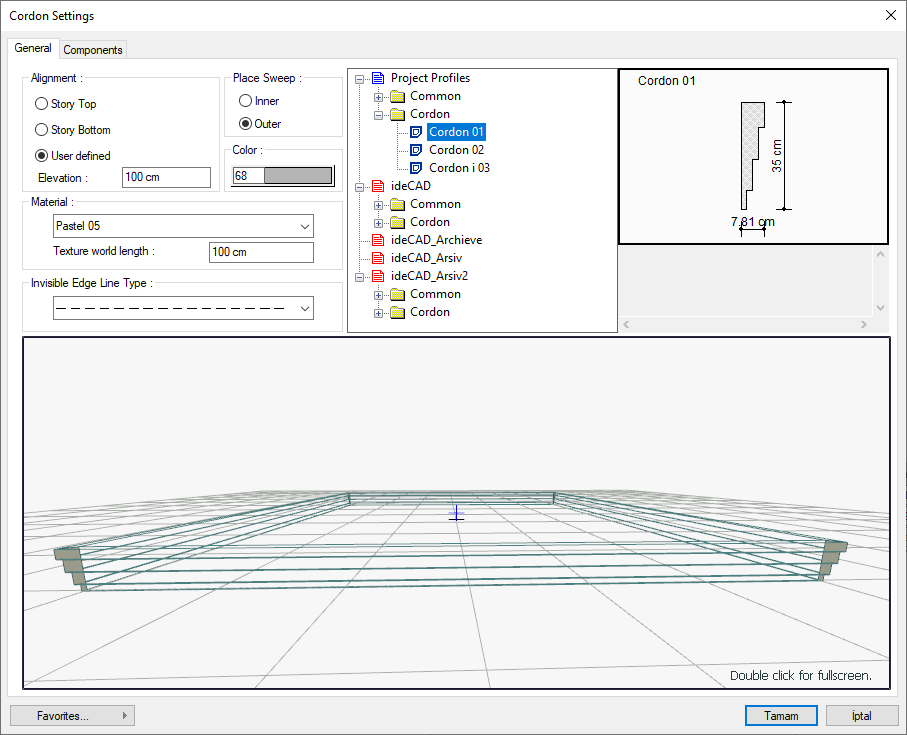 With the Cordon Settings command, the alignment type, elevation, material and drawing settings of the cordon object can be accessed.