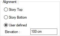 Alignment ![]() The position of the cordon within the story is adjusted. If "story top" is marked, cordon is placed on the ceiling of the story, if "story bottom" is marked, cordon is placed on the story floor. If "User defined" is marked and the elevation is given, the cordon is drawn according to the entered story floor as high as the entered elevation. |