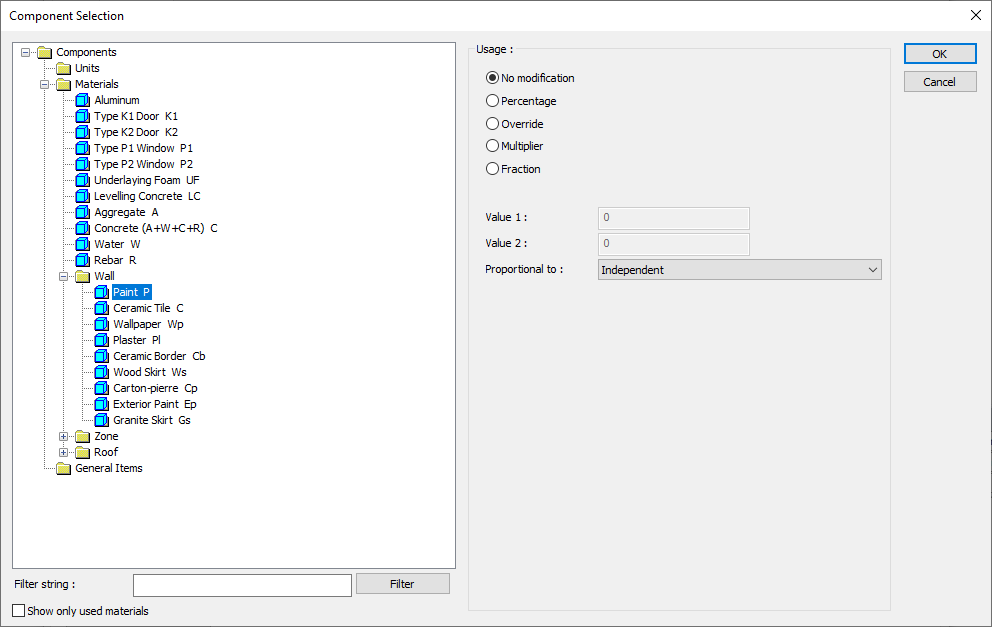 Click the OK button. The "Component Selection" dialog will be closed. A summary line of the material will appear in the Building Components tab. More than one material assignment can be made to an object.