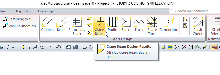 After the analysis is done, you can access it by clicking the Crane Beam Design Results command under the Steel Design heading in the ribbon menu Analysis and Design tab .