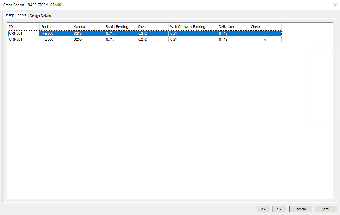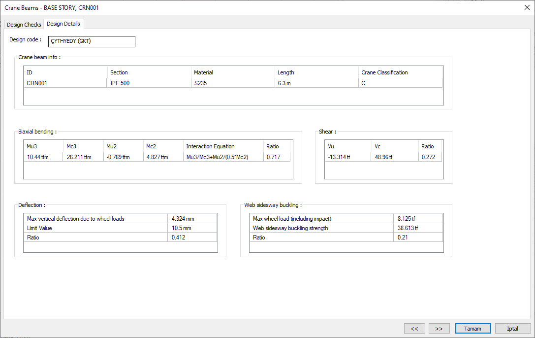 The steel crane beam design results and the failure conditions of the crane beams are displayed in the Crane Beams dialog. In the Crane Beams dialog, the material and section properties of the crane beams, biaxial bending interaction ratio, deflection control and body crease controls are displayed.