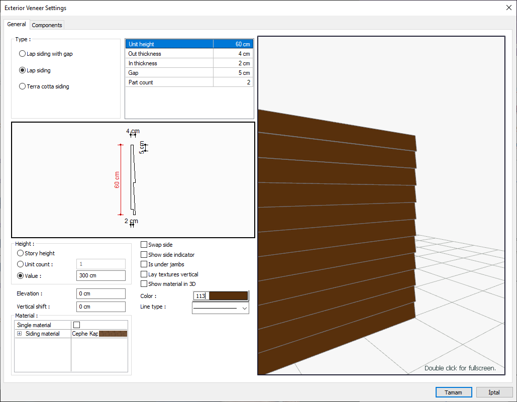 You can find detailed settings for siding under the heading Exterior Veneer.