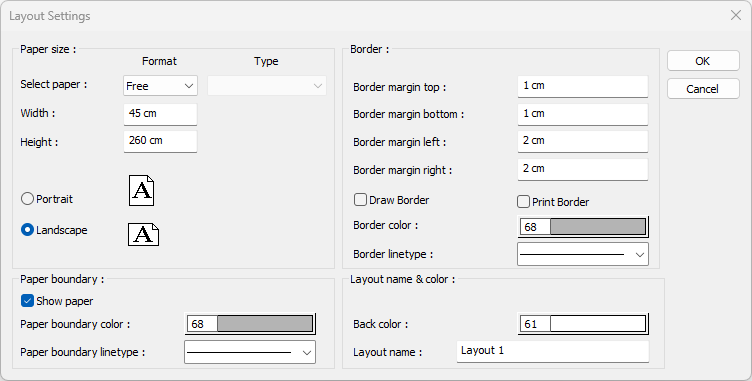 In the layout settings dialog, select the paper size as free and enter 450 mm for the width and 1200 mm for the height value.